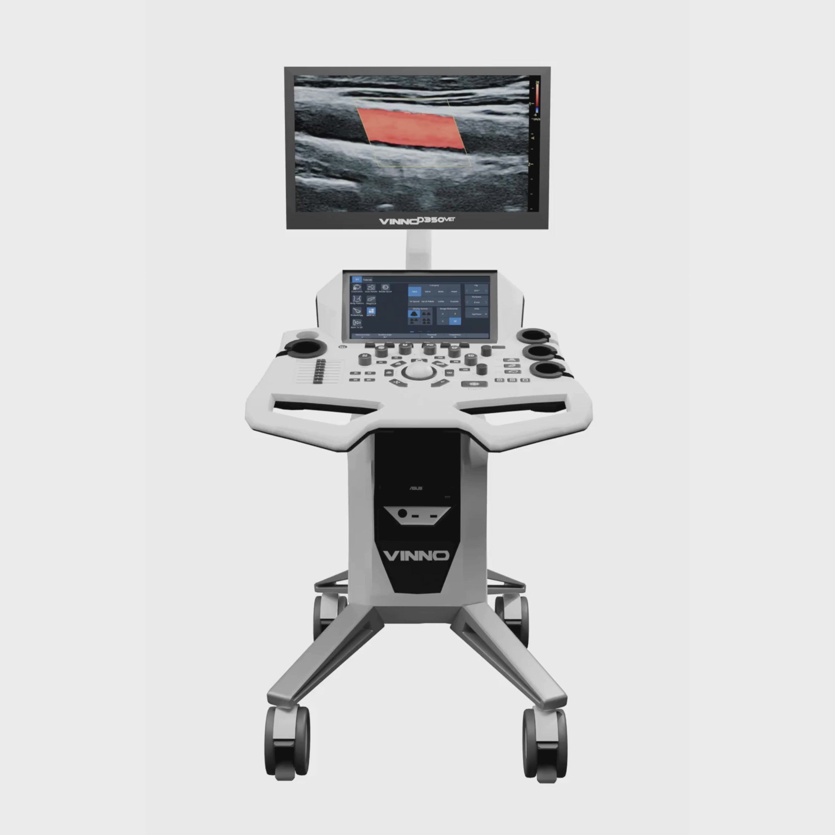 El VINNO D350 VET se destaca por su diseño elegante y moderno, combinado con tecnología avanzada para satisfacer las necesidades de diversas especialidades médicas. Equipado con un monitor LED de 24 pulgadas de alta resolución y una pantalla táctil interactiva de 10 pulgadas, este ecógrafo proporciona una interfaz de usuario intuitiva que facilita el flujo de trabajo clínico.